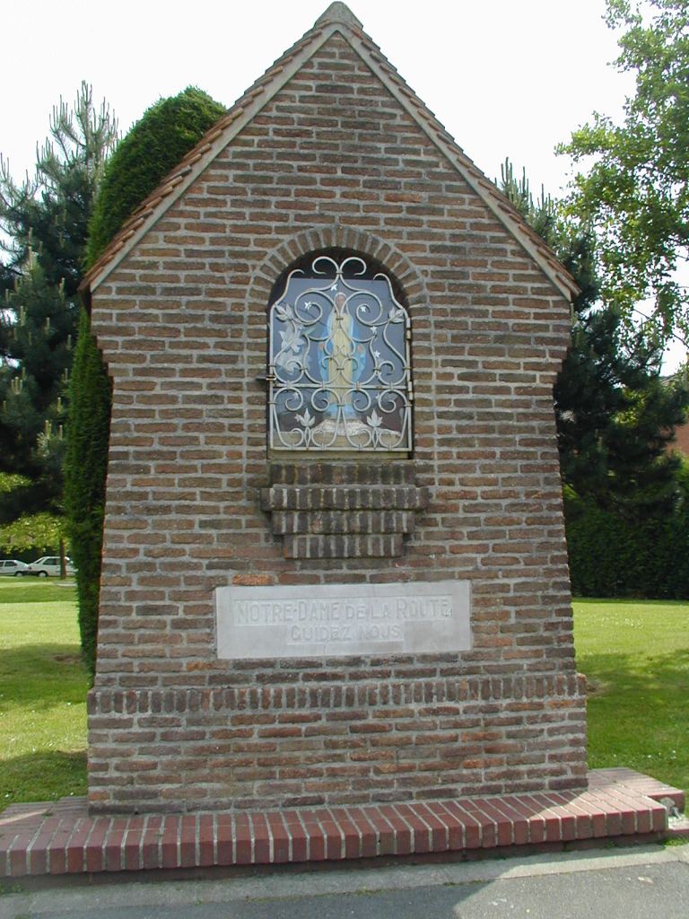 Construit par la mairie en contre partie de la chapelle détruite parce que située devant la façade de la mairie rue De Gaulle. La statue N-D de la Route, offerte par le curé E.Lefebvre en 1954 au quartier de la » Petite Frontière » est installée en 1961. Chaque année, c’est le point de départ de la procession du 15 Août, la Sainte est portée jusqu’à l’ église Saint Vaast.