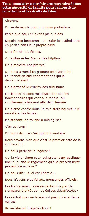 « Ils protestent au nom du peuple qu’on appelle faussement souverain, car jamais, les électeurs n’ont donné à leurs députés ou à leurs sénateurs le mandat de séparer l’Église de l’État et de fournir un nouveau prétexte à toutes les discordes qui divisent notre malheureux pays.