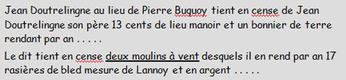 Ce Jehan DOUTRELIGNE eut un fils, également prénommé Jehan, qui, en 16O1, exploitait pour le compte de son père deux moulins à vent. Il s’agit là des moulins de Fournette, un moulin à blé et un moulin à huile.
