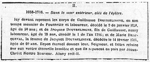 La troisième génération des meuniers DOUTRELIGNE est représentée par Guillaume DOUTRELIGNE, meunier de Fournette et laboureur; il avait épousé Catherine DESPLANQUES. Il mourut à Leers le 9/1/1658. Sa pierre tombale se trouvait sur le mur extérieur de l’église, du côté de l’épître. Elle évoquait son souvenir et celui de son fils Jacques DOUTRELIGNE décédé à Leers le 1/1/1716 âgé de 7O ans qui avait épousé en premières noces Catherine LECLERCQ, et après le décès de celle-ci, en secondes noces à Néchin le 23/6/1671 Marie BRACAVAL, fille de Philippe et de Barbe DALECROIX.