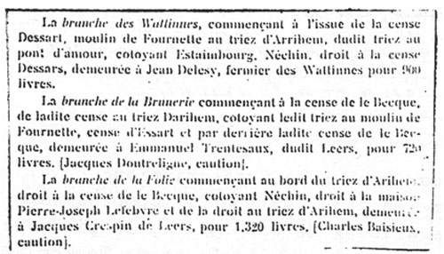 Le document relatif à cette adjudication a été conservé aux Archives Départementales du Nord, il expose les conditions de prise en charge de la recette des dîmes et le détail de chacune des branches, c’est-à-dire les limites de chacune des circonscriptions.