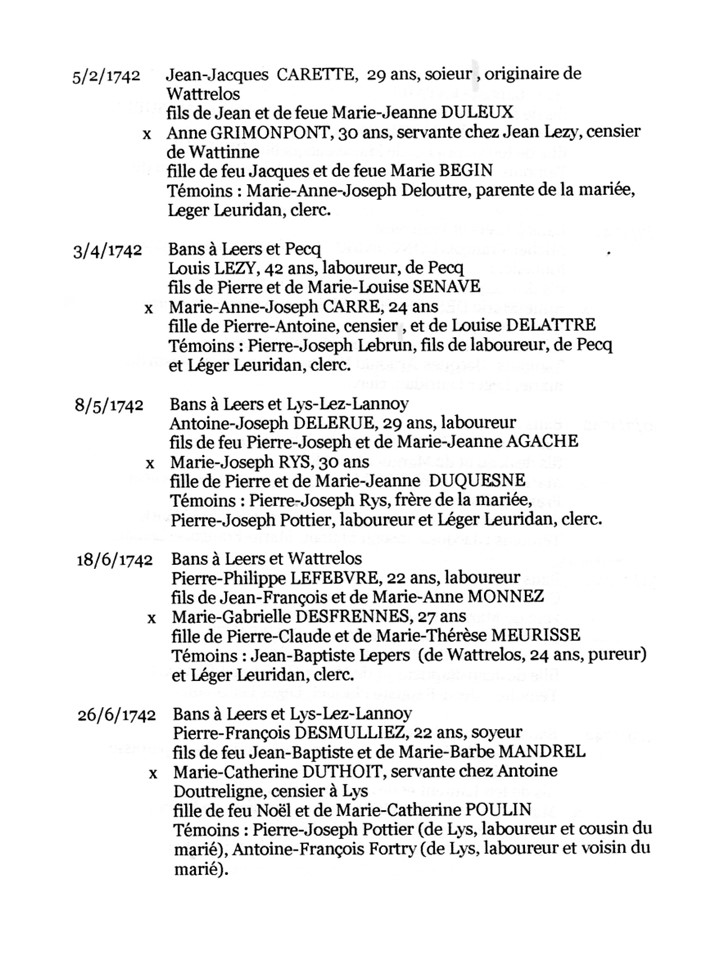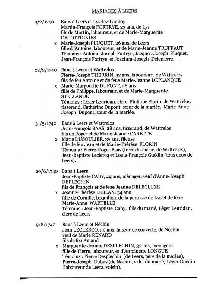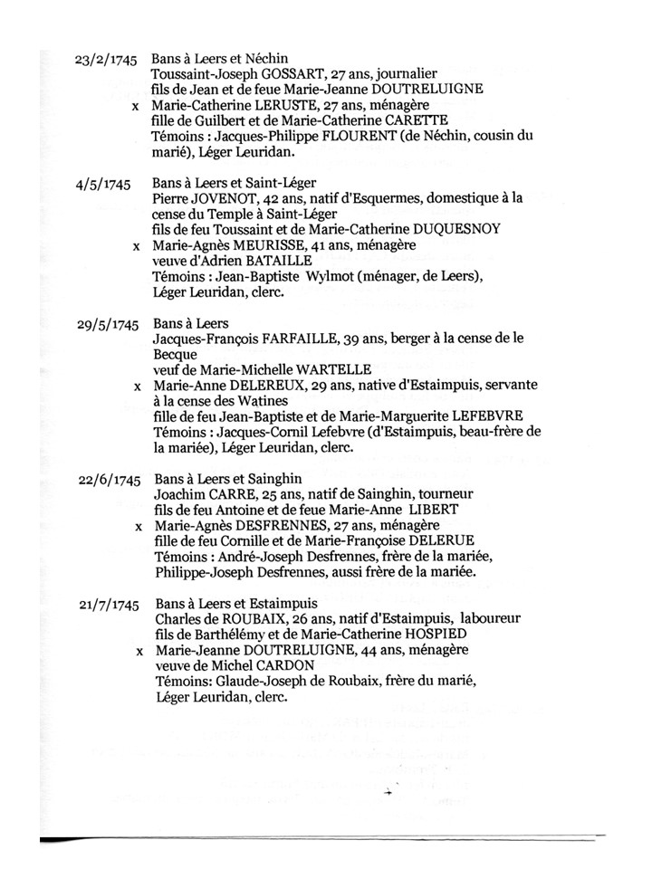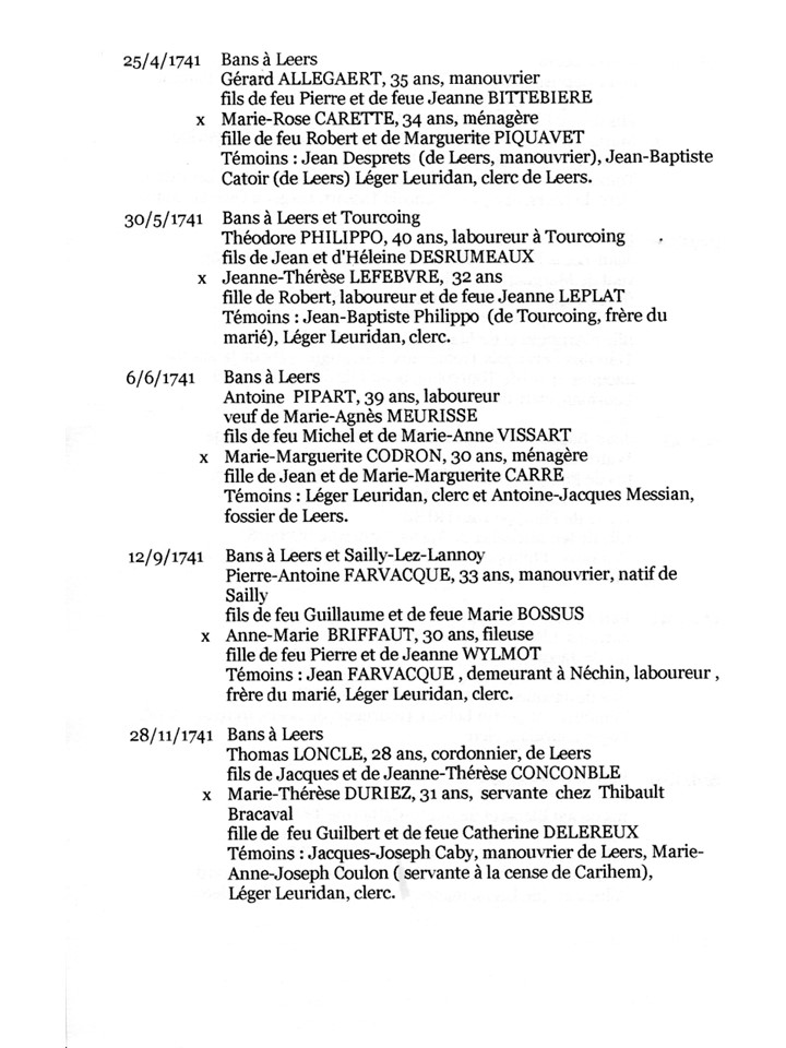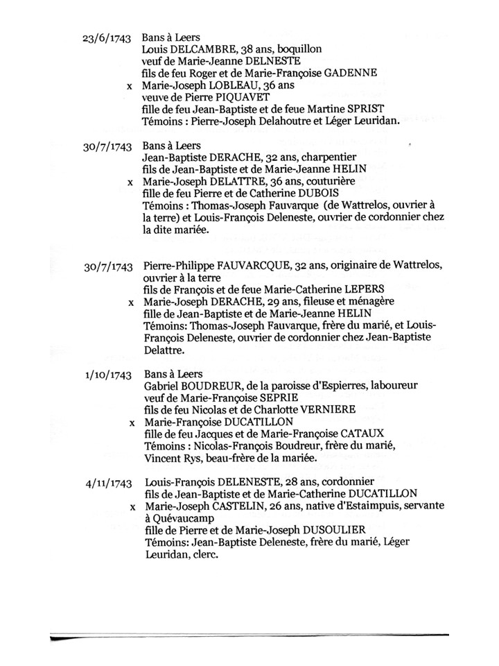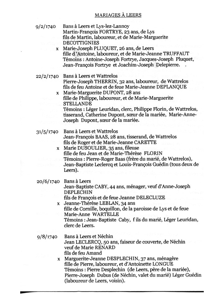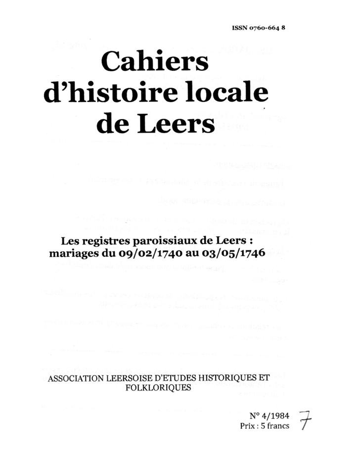 - Livret n°7 – Les registres paroissiaux de Leers mariages de 1740 à 1746